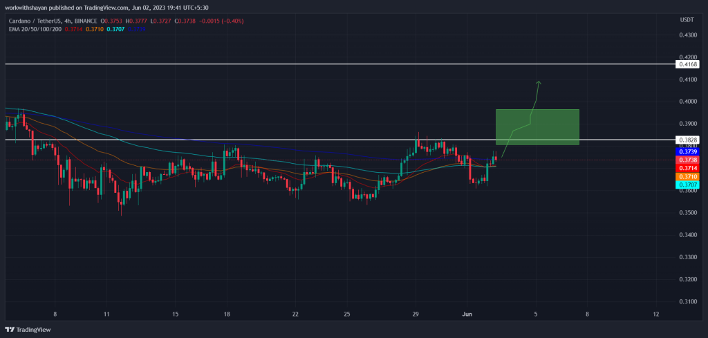 Cardano experienced a solid surge today as the price initiated a breakout above $0.365. ADA price continued to show upward momentum as it broke past the EMA20 line at $0.3715.