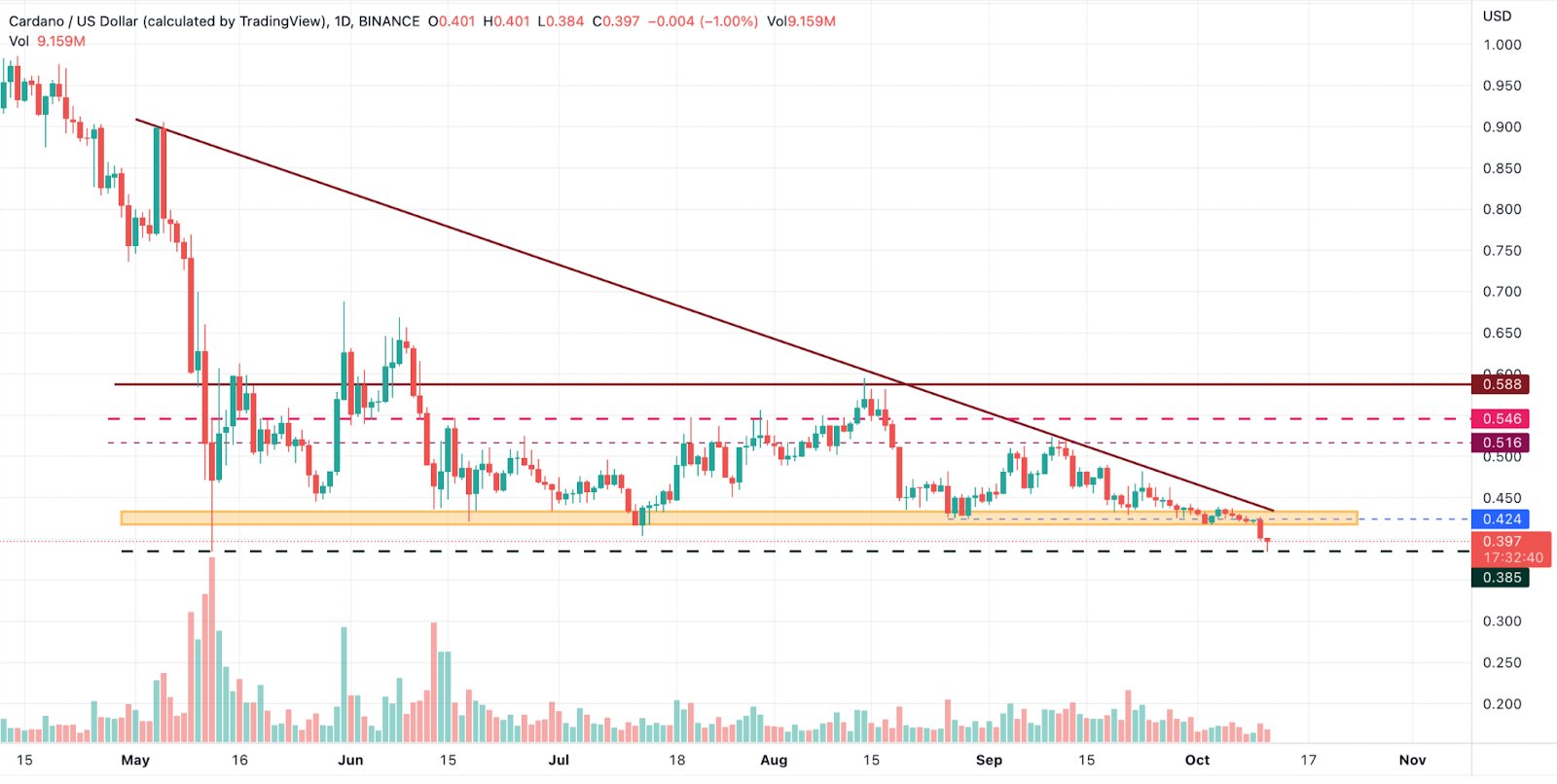 The ADA price has been trading within a descending triangle for quite a long time, and the recent price action dragged the price below the crucial demand area. Moreover, the asset re-visited the yearly lows at $0.384, which has triggered a bearish trend for a long time. Therefore, the next couple of hours appears to be extremely crucial for the asset