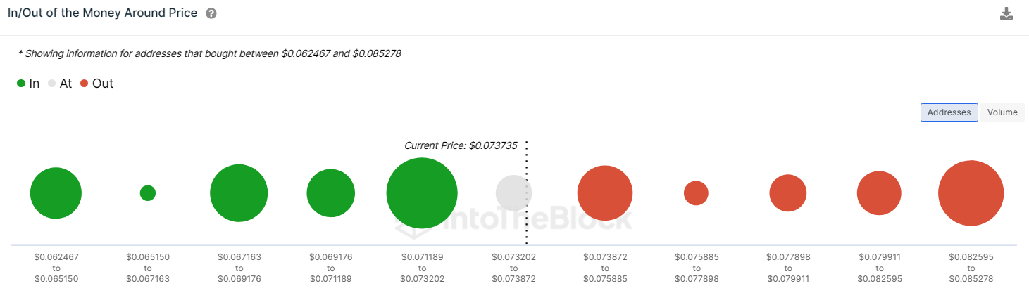 Data from IntoTheBlock reveals that the lower level is a zone where 212,000 addresses hold 14 billion Dogecoin, ranging from $0.0718 to $0.0738. The upper level is a zone where 78,800 addresses hold 9.2 billion DOGE, ranging from $0.0745 to $0.0765.