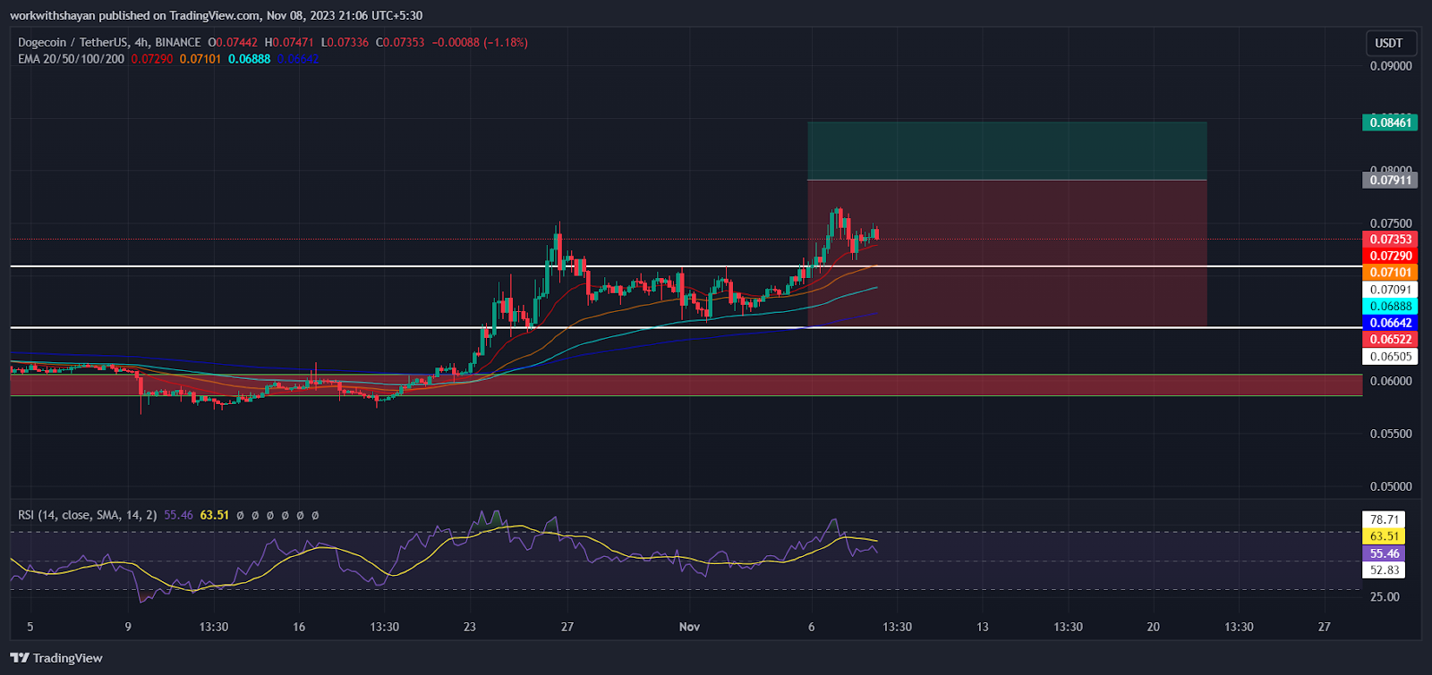 The price of Dogecoin recently rebounded from the 20-day EMA at $0.071, showing a shift in mood from selling on highs to buying on lows. As of writing, DOGE price trades at $0.0736, surging over 1.3% from yesterday’s rate.