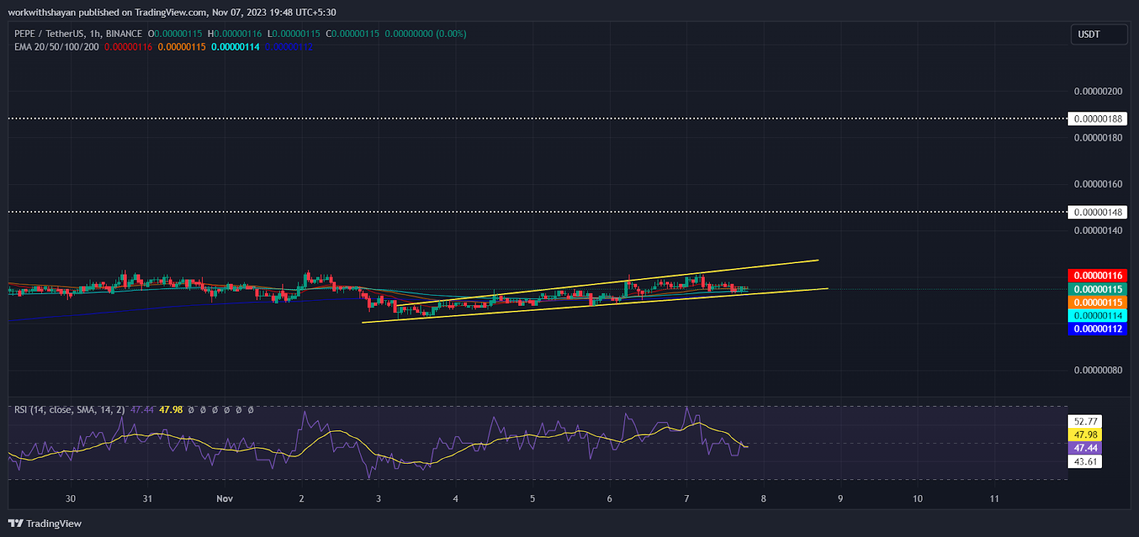 Despite Pepe coin achieving an impressive 60% increase in October, it hasn’t maintained this momentum into November, facing several resistance points. Consequently, the price of Pepe coin has seen less than a 1% rise in the opening week of the month, indicating a slowdown in the rally of memecoins.