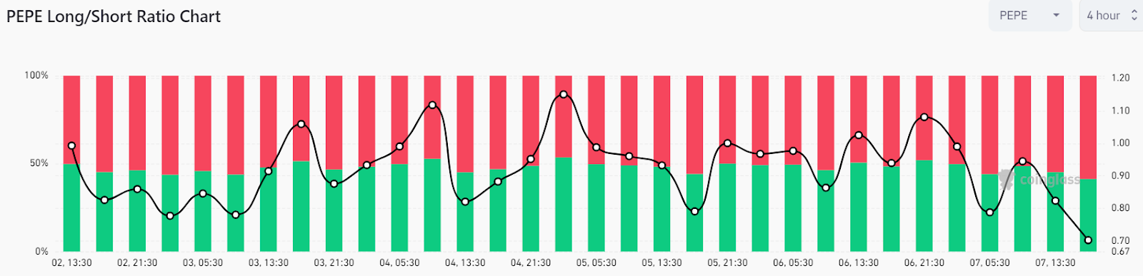 Moreover, the sentiment among traders is shifting towards bearish positions, as seen by the long/short ratio’s downturn. The indicator has dropped to a low of 0.7021, with shorts accounting for over 58% of positions, showing a majority preference for betting against the coin. Nevertheless, the bulls haven’t given up the fight entirely, upholding the resistance with 42% of positions being long.