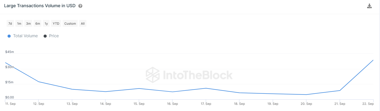 According to data from IntoTheBlock, there has been a noteworthy increase in whale transactions in the past 48 hours. While this metric experienced a surge on the 20th, it accelerated even further on September 21st, reaching a total whale transaction value of over $47 million.