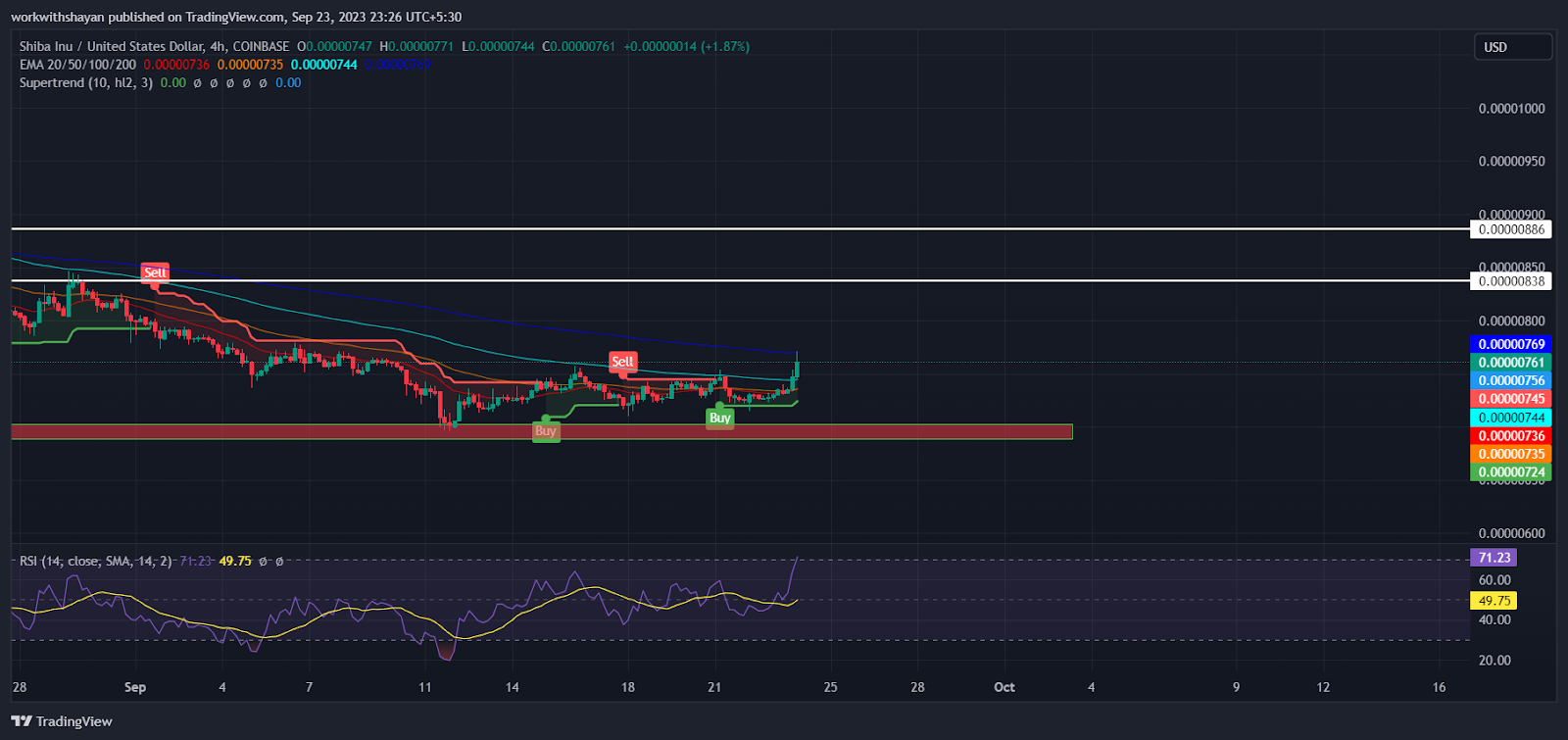 SHIB’s price witnessed robust buying activity in the last few hours as buyers successfully broke above the bearish channel pattern at $0.0000073, surging past the EMA100 trend line. However, sellers are defending another surge by creating a strong resistance near EMA200. As of writing, SHIB price trades at $0.0000076, surging over 5% from yesterday’s rate.