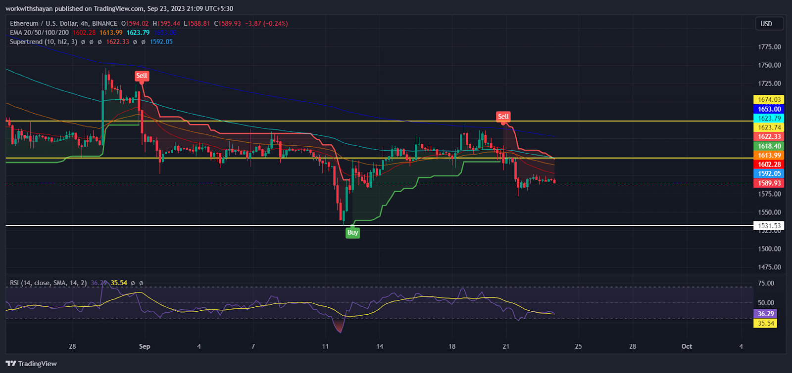 Ethereum continues to face rejection at the 20-day Exponential Moving Average (EMA) at a price of $1,602, signaling the ongoing bearish sentiment and a tendency for sellers to capitalize on price upticks. As of writing, ETH price trades at $1,588, declining over 0.55% from yesterday’s rate.