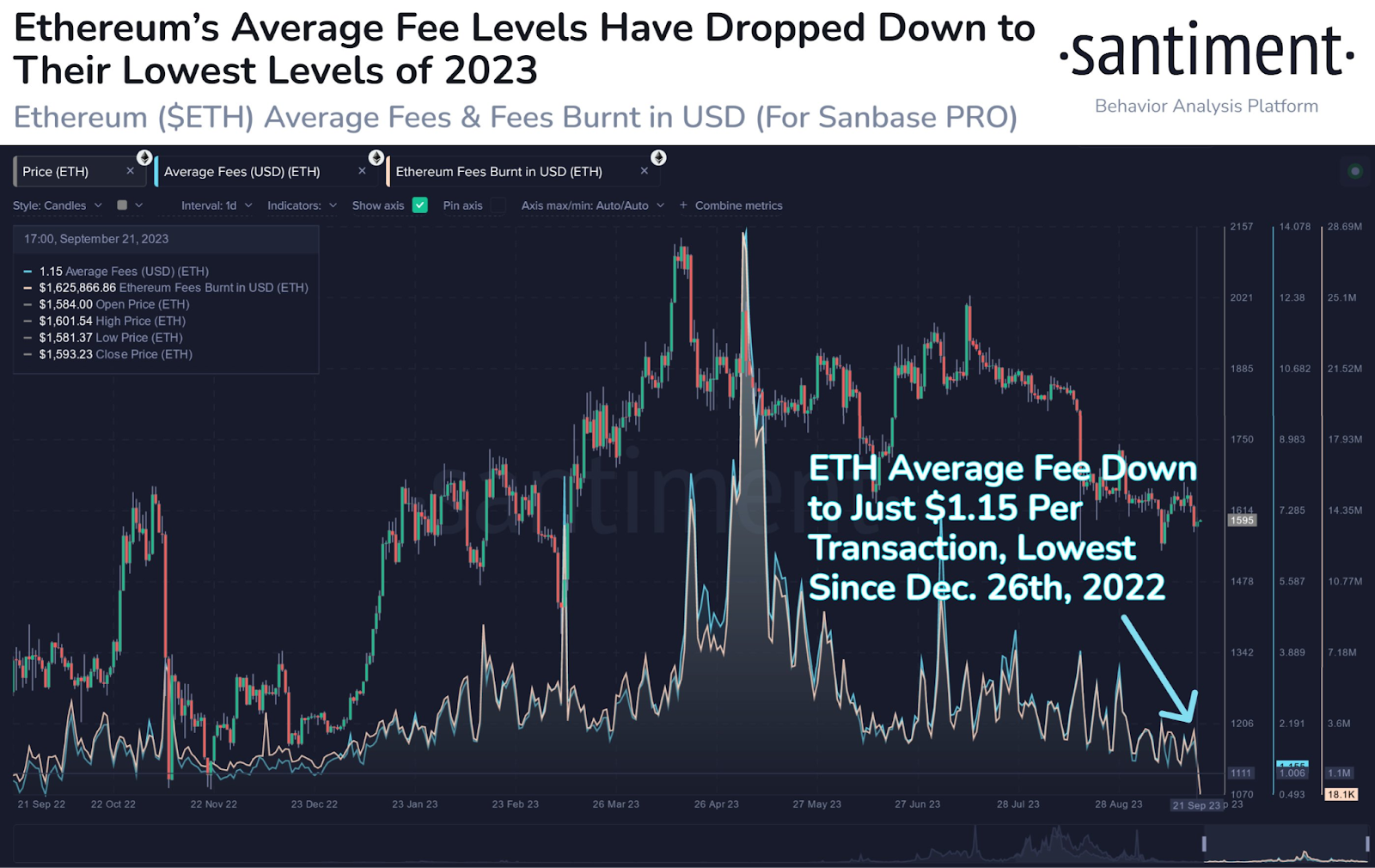 Nonetheless, there’s a noteworthy development observed by Santiment. Ethereum’s average fee has reached a nine-month low, reaching the level of $1.15, a figure last witnessed on December 26, 2022. According to Santiment, historical data suggests that Ethereum’s utility tends to rise when ETH becomes more affordable to transact, which can accelerate ETH’s recovery.