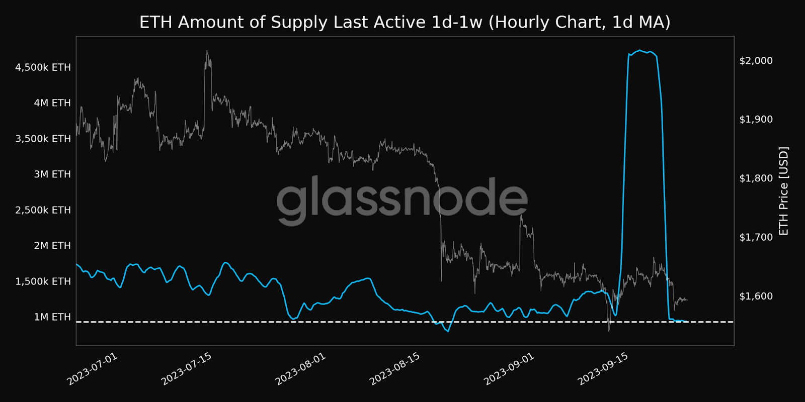 Based on insights provided by Glassnode data, there has been a notable surge in activity among short-term Ethereum holders in recent hours. On-chain data reveals that the quantity of Ethereum supply that was last active within one week to just one day ago has now reached its lowest point in one month. With the 1-day moving average (MA) dropping to 926,194.509 ETH, it signals a sentiment shift in Ethereum’s on-chain activity.