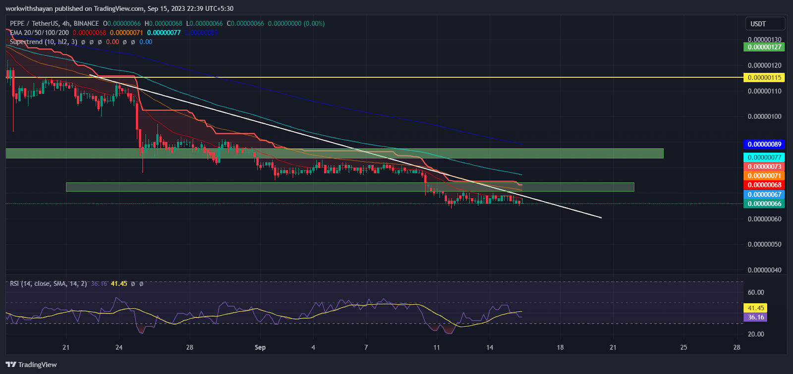 While the cryptocurrency market experienced a welcome upswing this week, reaching a high of $26,500 for Bitcoin, PEPE’s price didn’t follow suit. It remained cold, unable to capture the bullish momentum, thereby keeping the price in a bearish zone. As the week draws to a close with PEPE still on a downward trend, holders of this meme coin are eagerly awaiting an opportunity to ‘buy the dip’ in the days ahead.