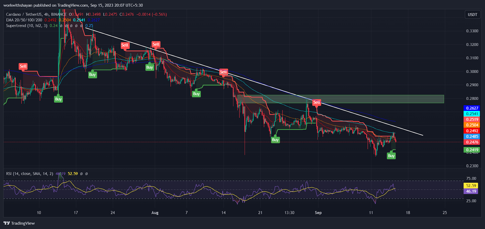 Over the last few hours, ADA price witnessed solid rejection in attempting to surge above the crucial resistance level of $0.25 as bears intensified their selling domination to prevent an immediate surge. However, buyers are defending a decline below the $0.24 level to hold buying sentiment. As of writing, ADA price trades at $0.248, declining over 0.9% from yesterday’s rate.